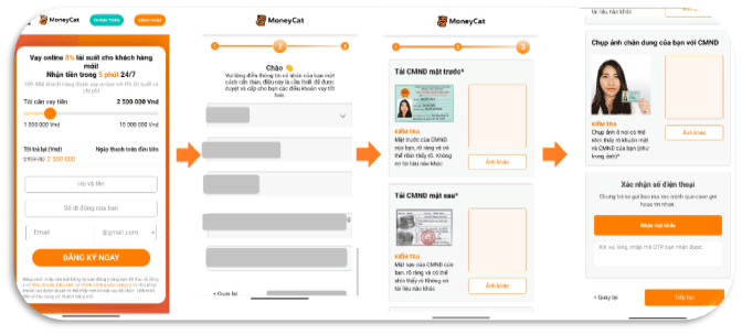 Chỉ với một vài thao tác đơn giản bằng cách điền đầy đủ thông tin cần thiết tại trang chủ https://moneycat.vn/ và nhập mã OTP xác nhận từ hệ thống gửi đến số điện thoại đăng kí để hoàn tất thông tin.